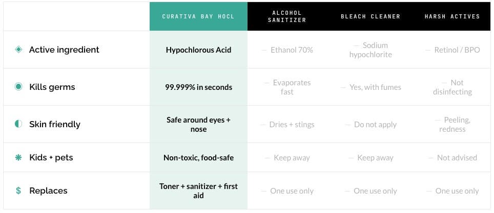 Hypochlorous acid (HOCl) is not a trendy new ingredient. It is the exact compound your white blood cells produce to neutralize bacteria, viruses, and fungi. For decades it was confined to hospital burn units because it was unstable in a bottle. Curativa Bay solved that. You get the same powerful molecule your body makes on its own, now stabilized at skin-friendly levels. If you have been looking for a cleaner alternative to alcohol, benzoyl peroxide, or bleach, this is it.